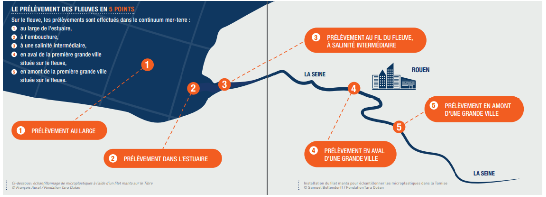 Marins et scientifiques à bord de Tara ont rapporté 2 700 échantillons situés entre terre et mer. Tamise, Elbe, Rhin, Seine, Èbre, Rhône, Tibre, Garonne, Loire, les échantillons et les données ont été récoltés au large des estuaires, à leur embouchure, en aval et en amont de la première grande ville à forte population située sur les fleuves.